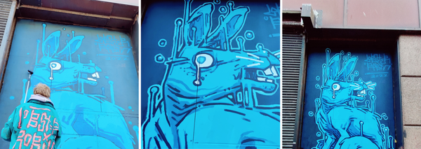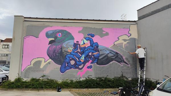 Local artist Lobster Robin was back in town for 2 months and took the time to paint the very first chapter of 'Le MUR'. A combination of flashy colors, signature juicy lines and childhood  memories created this cool pigeon. Cause pigeos are a symbol of the city, right? Or maybe he got inspred by this pigeon who kept hanging out in front of the wall all day.....